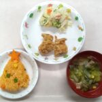 12月25日はクリスマスランチでした。 メニューは 『ツリー型チキンライス、鶏のから揚げ、ポテトサラダ、白菜のスープ』です。 ...